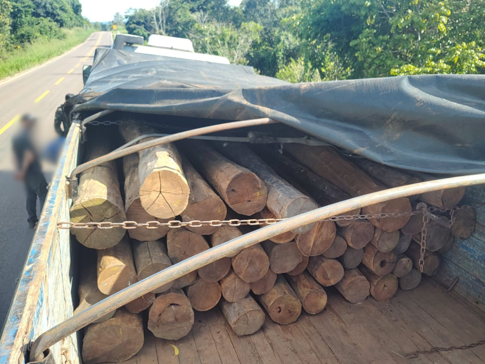 Durante patrulhamento na rodovia, a equipe abordou um caminhão que trafegava no sentido do município de Colorado do Oeste e constatou que o veículo transportava madeira da espécie Itaúba sem a devida documentação ambiental.