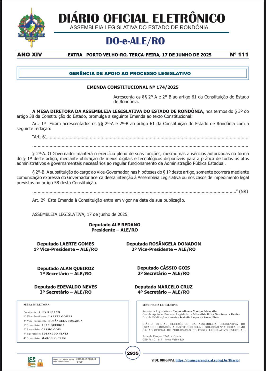 Numa decisão “bem pensada”, os deputados estaduais de Rondônia aprovaram na noite desta terça-feira (17) e publicaram em edição extra do Diário Oficial Eletrônico da Assembleia (DIOF), uma mudança na Constituição do Estado. A partir de agora, o governador poderá continuar tomando decisões administrativas e políticas mesmo estando fora do país, usando ferramentas digitais.