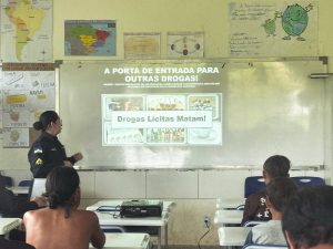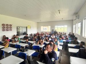 Durante a atividade, policiais militares do Programa Educacional de Resistência às Drogas e à Violência (PROERD) ministraram uma palestra educativa abordando temas como os efeitos do álcool, tabaco, cigarro eletrônico (vape), drogas ilícitas, além dos riscos relacionados à violência e à criminalidade.